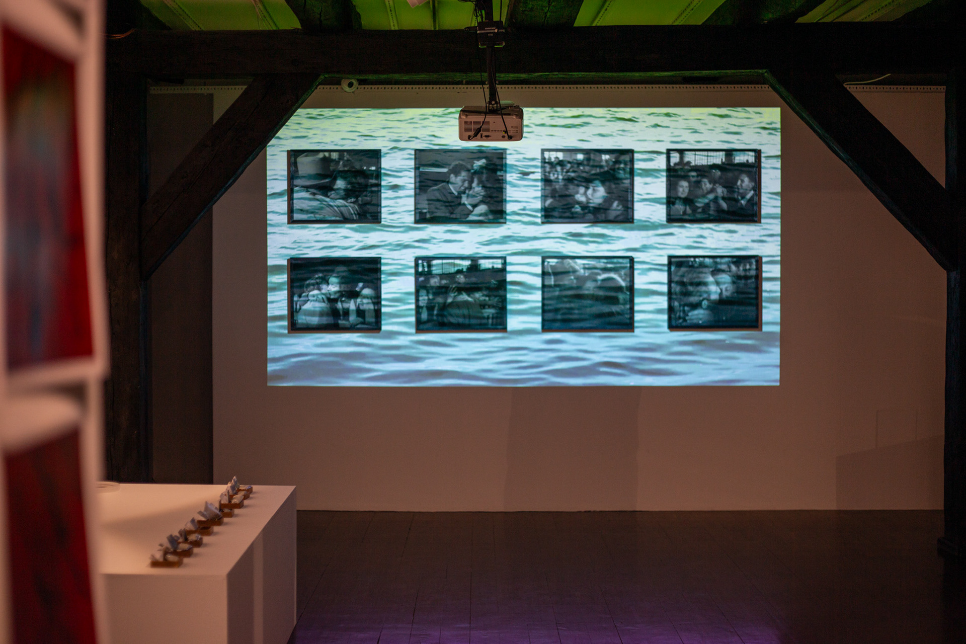 The stills are accompanied by a projected video created by the artist, where the movement of sea and human figures suggests the passage of time and the crossing of distance. A musical piece, Baby Lullaby by Alexander Blu, weaves through the work, echoing themes of care, return and tenderness.